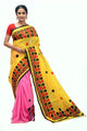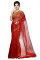 Enjoy the festive season with this 'Bead Hand-Embroidery Ethnic Bengali Saree for Festivals from Bengal. Beautifully designed in Rusty Red base with all over floral motifs & contrast colour . Wide Border and Pallu is adorned with wonderful design motifs with colour thread and zari work mainly used for festival/ occasion purpose.