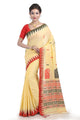 Bring out your cheerful spirit adoring this Stylist Cotton Handloom Saree in Off White & yellow colour. This drape is enhanced with designs woven throughout Green & Light Brown colour threads in abstract and foliage motifs. The wide border with Green colour features various motifs which are woven in thread works