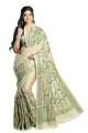 Kantha stitch is a traditional form of making thread work on fabrics in Bengal. This is a beautiful bottle green Bangalore silk saree. This saree is purely designed with traditional kantha stitch in white, creating a mesmerising combination. The design of the borders is in 4 horizontal segments. It has kalkas, checkered and alpona design in tapestry pattern. The same is in the pallu in repeated manner. The motifs in the body are typical alpona designs. Another is a similar peacock blue saree with floral motifs and alpona designs. The flowers are hand stitched with filling stitches and the alponars are done in run stitch. The pallu has a dense floral work. The other saree is a maroon one with multi colour thread work. The borders and pallu have dense floral deisgn and the motifs in the body are like the bottle green saree. All these sarees have blouse piece.