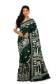 Here is a beautiful kantha stitch saree with patchwork. The colour of the saree is in red and black combination. The red portion features batik work. The border line and the rest of the saree is in black and is designed with kantha stitch. Kantha stitch mostly is done by run stitch and filler stitches. This saree features lotus in the lower portion of the body and the pallu have kalkas and lotuses along with red butis. This saree have blouse piece with it.