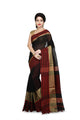Made of silk and cotton, Brown colour saree with wide Golden , Black and Red border on pallu with zari work - look even more beautiful. Exclusive Maheshwari Silk-Cotton Saree - It is also known for one of India’s finest fabric, and handloom weaving – The Maheshwari Sari. The graceful & sophisticated design is inspired by the local architecture and striped pallu. Once an exclusive privilege of the royalty has become an established choice of the woman. Free unstitch Blouse piece of this saree.