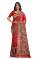 A beautiful and fast combination of blue saree and red border. This saree features a dense floral motif in tapestry design. Multiple colour thread works are also present in this saree. The textile used is a silk and cotton blend. No blouse piece is available with this saree. This saree is also available in black and red, and bue and pink combinations.