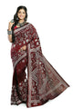 This is an off white blended kantha stitch saree with mauve borders. The body of the saree has batik print on it. The borders have floral design which features filling stitch. The upper border features geometric pattern designs. The pallu have denser floral works. The entire thread work is done in white and black threads. The second one is the same in biscuit colour with multi coloured thread works. The border edges have geometric pattern and the lower border also have triangle motifs with floral works. The pallu also features the same floral design. The base fabrics of these sarees are blended silk. Blouse piece available.